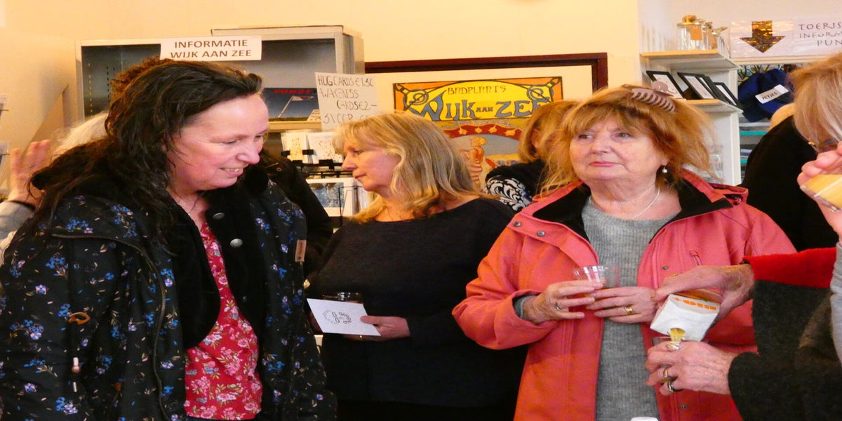 Een impressie van de openingsavond van de expositie BloemenZee op 4 maart 2022. De kunstenaars zijn Tineke van Hout, Gea Nagel, Elly van Dongen, en Jopie Mellema; de bezoekers zijn onder de indruk.