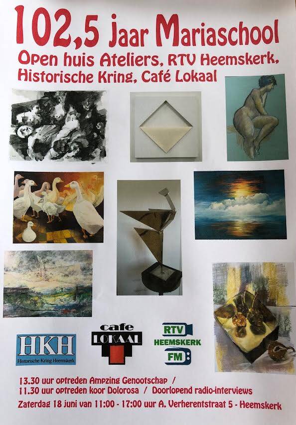 De expositie in het gemeentehuis van Heemskerk is inmiddels achter de rug. Wat er wel te beleven valt, is een open huis in de Mariaschool zelf. Op zaterdag 6 juli openen acht kunstenaars hun werkplaats van 11 uur 's ochtends tot 17.00 uur 's middags. De school ligt aan de A. Verherenstraat in Heemskerk tegenover de Laurentiuskerk.