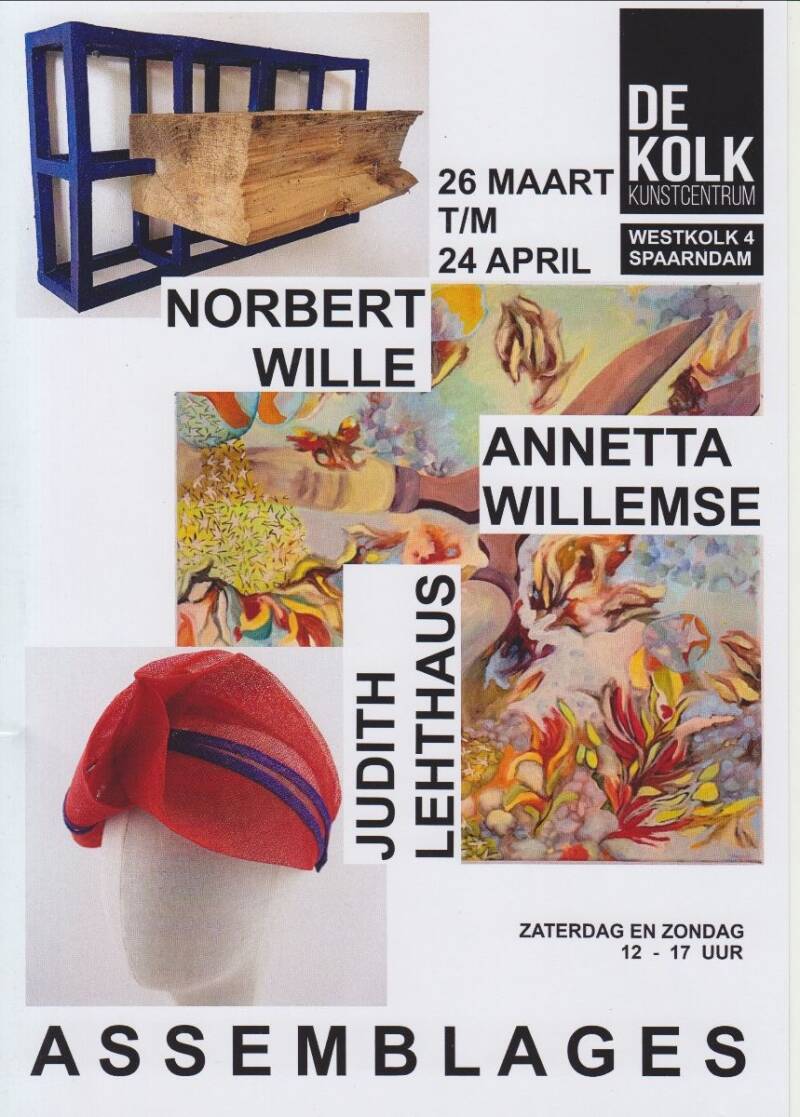 Norbert Wille, Annetta Willemse en Judith Lehthaus in Kunstcentrum De Kolk te Spaarndam. Verrassend en verfrissend werk: assemblages, bloemen en hoeden.