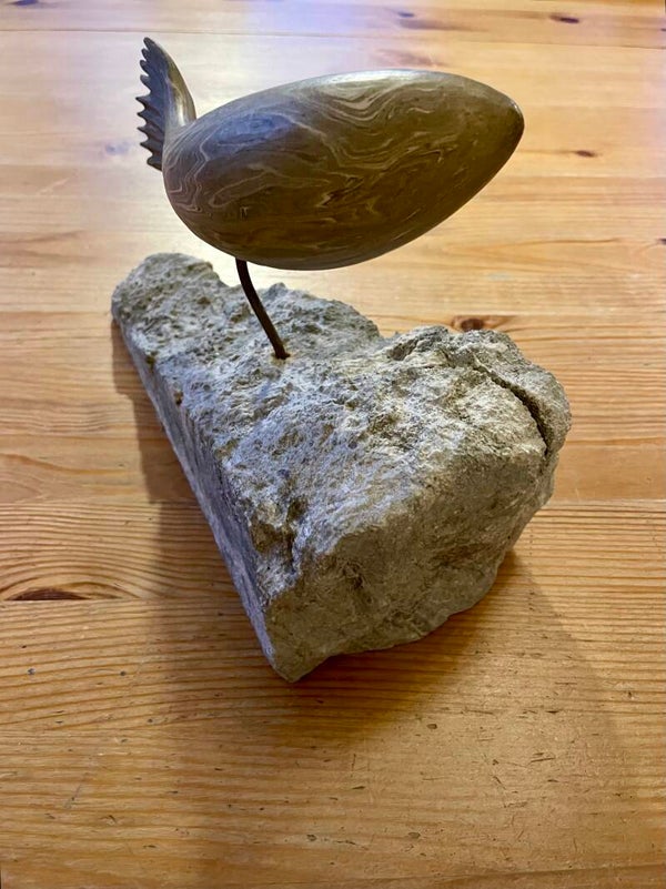 gemeleerd van kleur, gestroomlijnd. De vis kan van de standaard afgehaald worden. De voet is natuursteen.